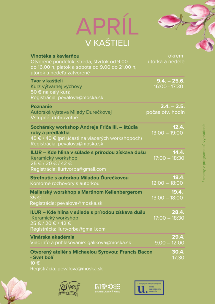 Aprílový program v kaštieli tak ponúka bohaté spektrum aktivít pre všetky vekové kategórie – od tvorivých dielní cez umelecké stretnutia až po odborné podujatia. Stačí si vybrať a nechať sa inšpirovať jedinečnou atmosférou historického prostredia.