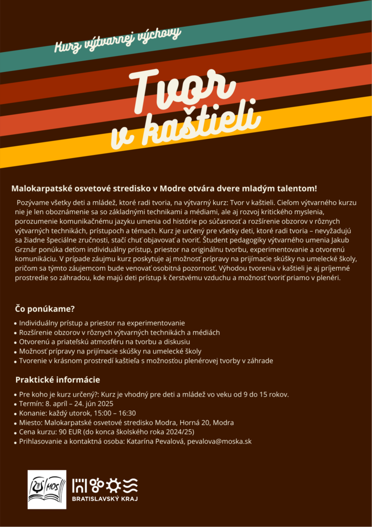 Po minuloročnom úspešnom ročníku bude kurz pokračovať pod vedením výtvarníka a študenta pedagogiky výtvarného umenia Jakuba Grznára. Kurz je určený najmä pre deti a mládež vo veku približne 9 až 15 rokov, no radi privítame aj starších záujemcov, ktorí majú chuť tvoriť a rozvíjať svoje výtvarné schopnosti. Nevyžadujú sa žiadne špeciálne výtvarné zručnosti – stačí chuť tvoriť, objavovať a experimentovať. Viac informácií nájdete v článku.